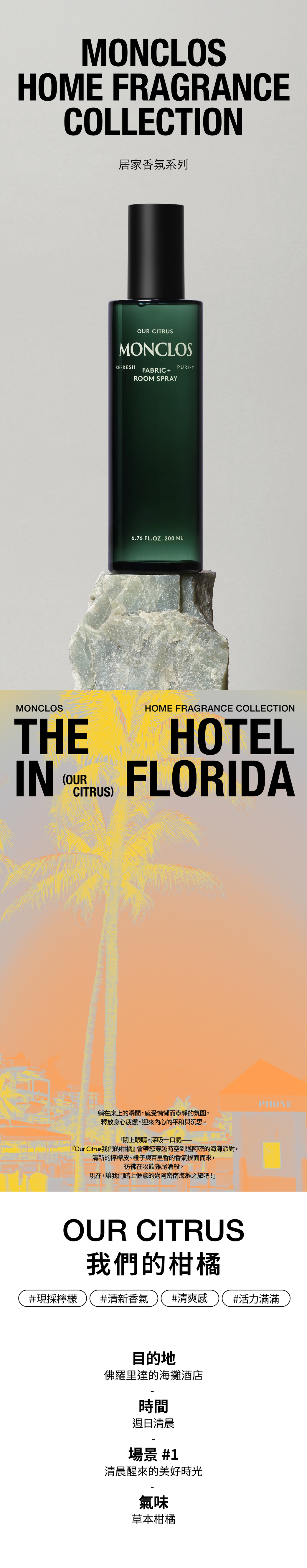 香調融合檸檬皮、百里香與木質苔蘚,層次豐富,彷彿置身佛羅里達的濱海飯店。