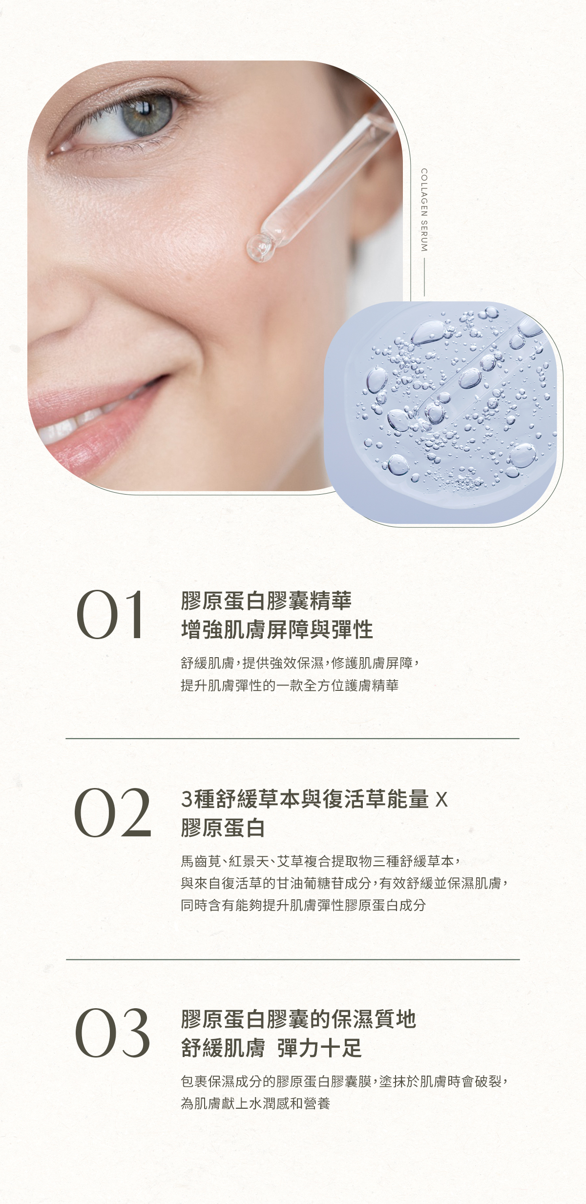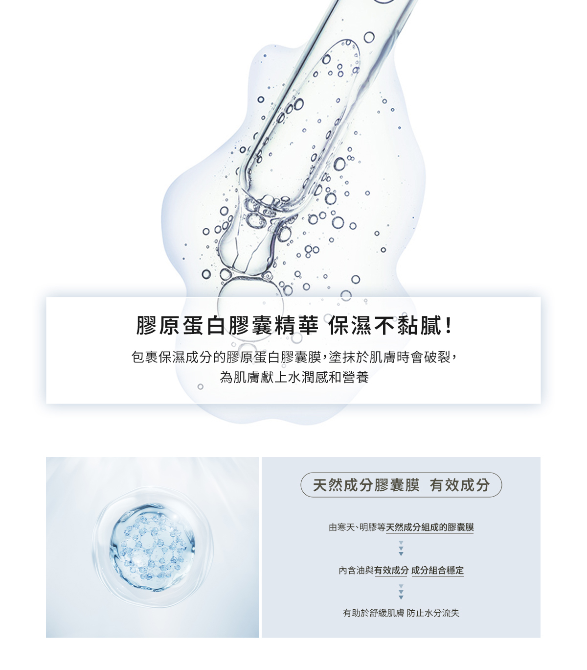 ✔ 膠原蛋白膠囊精華,保濕不黏膩!包裹保濕成分的膠原蛋白膠囊膜,塗抹於肌膚時會破裂,為肌膚獻上水潤感和營養