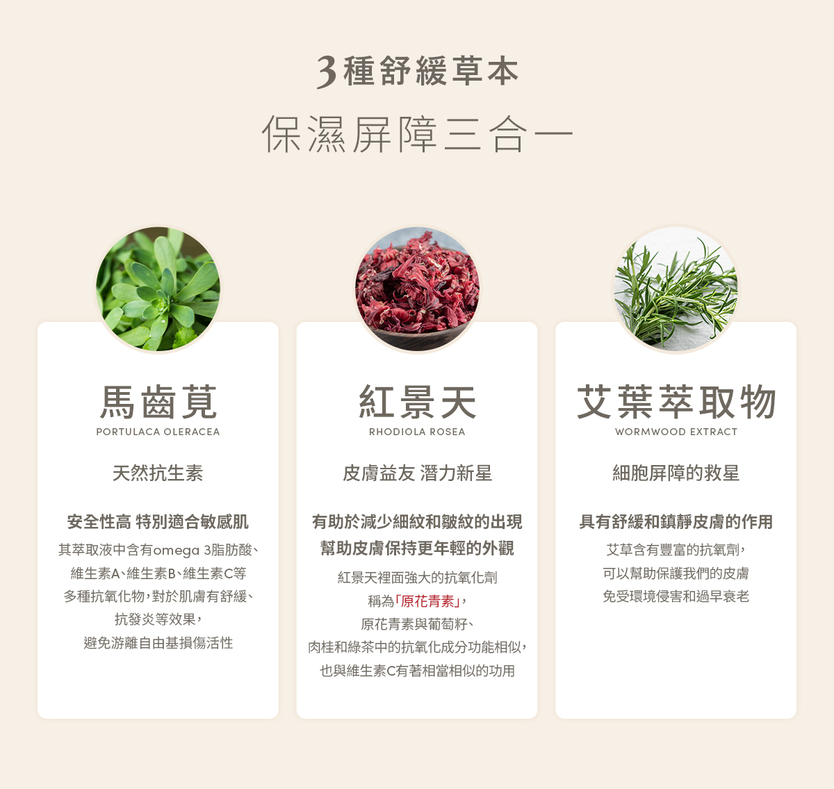 三合一保濕屏障,添加三種舒緩草本:馬齒莧、紅景天、艾葉萃取物。