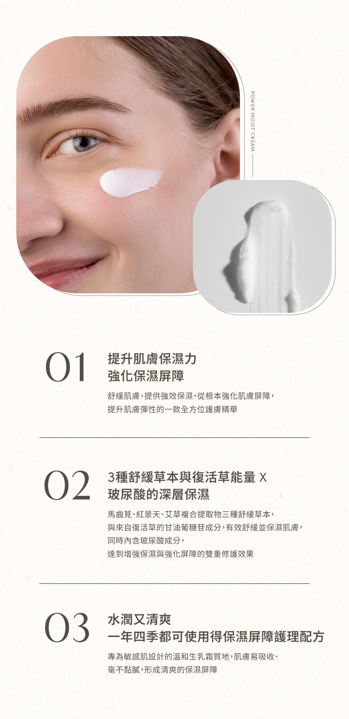 ✔ 三合一保濕屏障,添加三種舒緩草本:馬齒莧、紅景天、艾葉萃取物