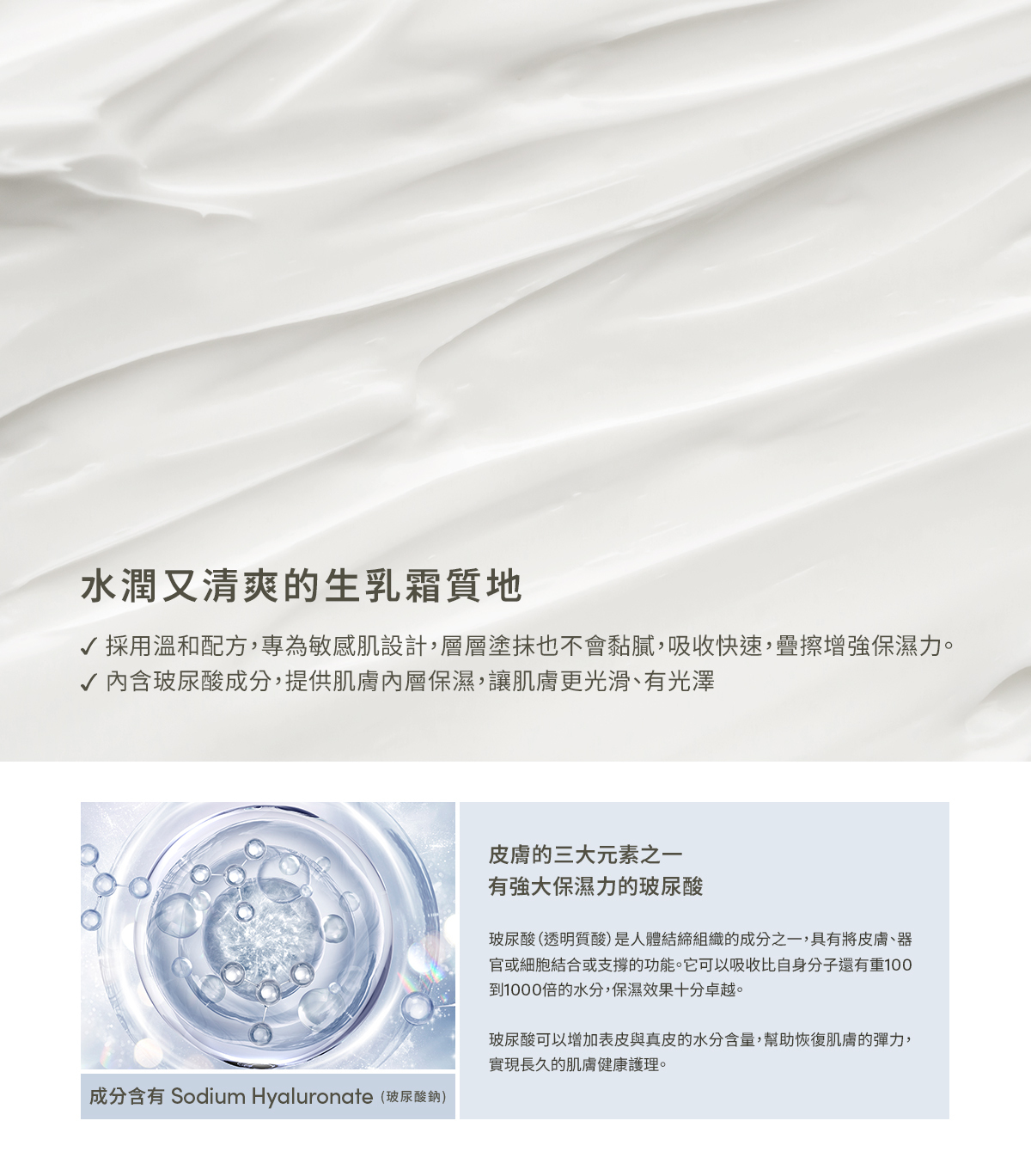 ✔ 水潤又清爽的生乳霜質地,專為敏感肌設計,層層塗抹也不會黏膩,吸收快速,疊擦增強保濕力