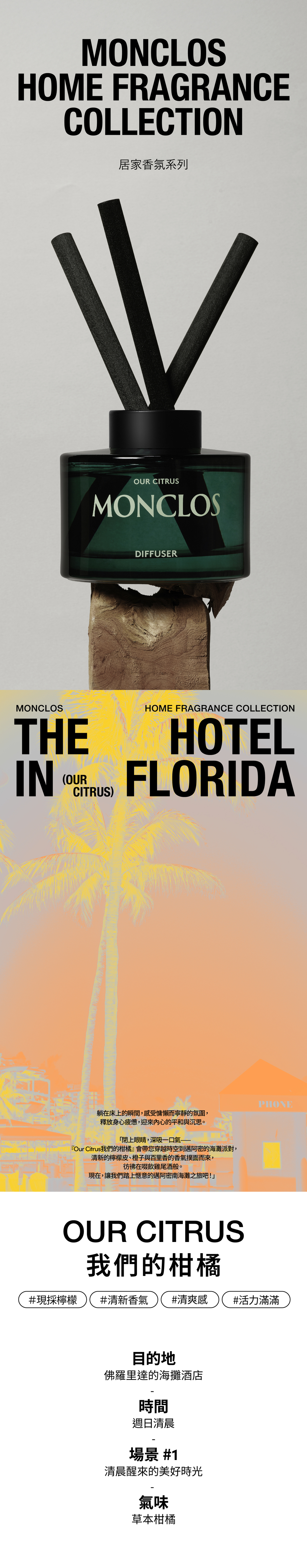 前調揉合檸檬皮、苦橙與小荳蔻,中調綻放酸模與百里香的清爽草本,最後以香葉天竺葵和木質苔蘚收尾,彷彿置身佛羅里達海灘飯店的清晨。