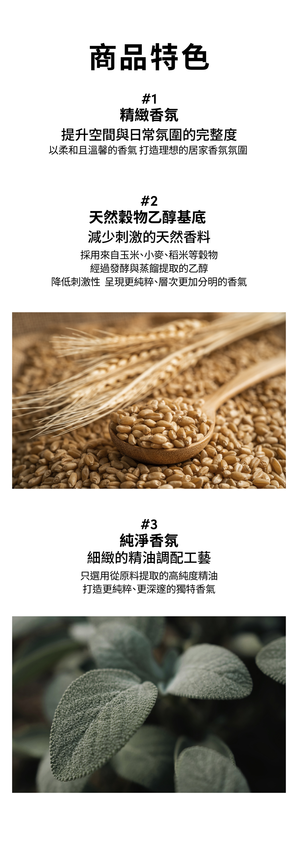 以天然穀物發酵乙醇為基底,搭配精選香氛精油,帶來溫和且層次豐富的居家香氣體驗。